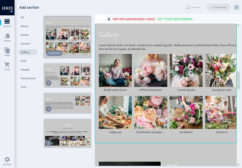 IONOS has a library of hundreds of website templates, but unfortunately, only 18 designs are available on the MyWebsite Now plan (one per industry: ie. Photography, Restaurant, or Fashion). It’s certainly a quality over quantity approach. I’d personally like more options, but this is enough if you want to get a site up and running fast.