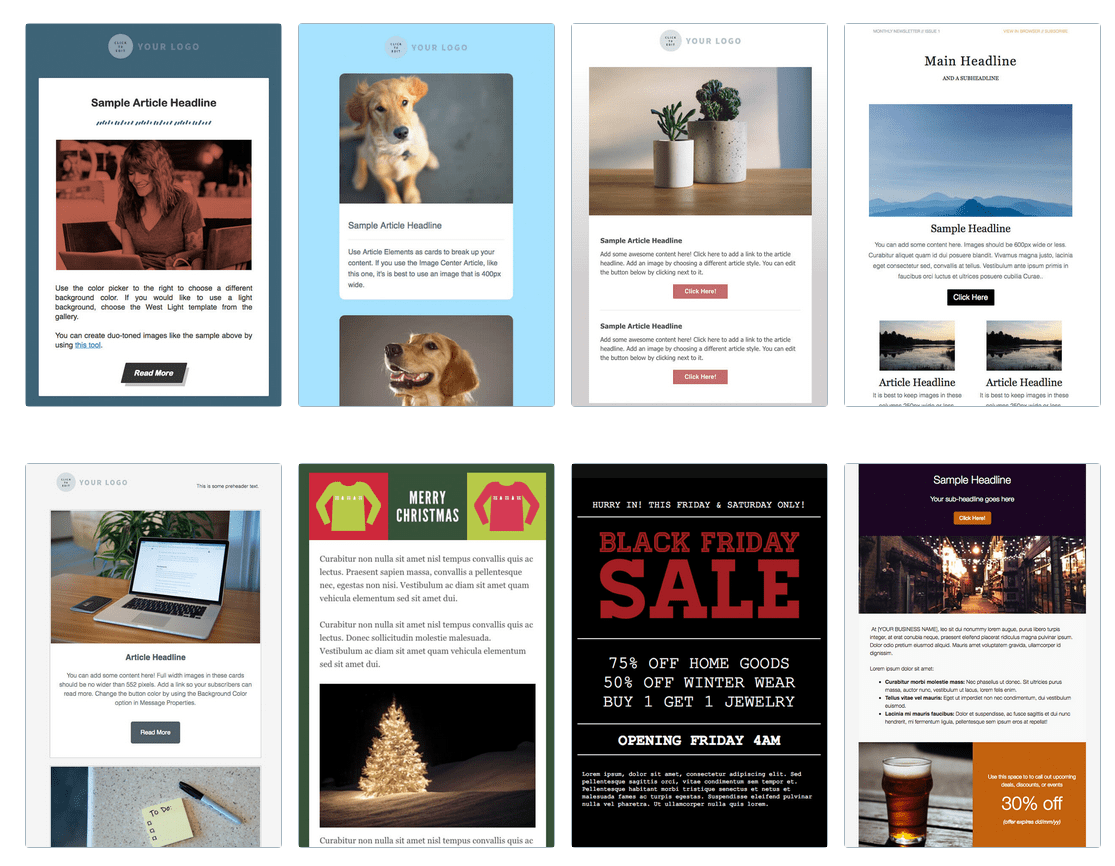 The drag-and-drop editor has 700+ templates, most of which are okay, even good. Some of them are very dated though, clearly belonging to the First Era of Email Marketing, when sabretooth tigers and mammoths roamed the web, usually in GIF format.