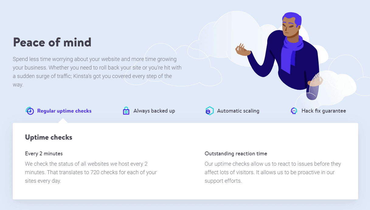 Kinsta wants to be your website’s overbearing helicopter parent. This approach to management might not be so great for people, but it’s fantastic for websites and most dogs. All plans come with website uptime checks that happen every 2 minutes, a guarantee that your website will be fixed if it gets hacked, and automatic server scaling.