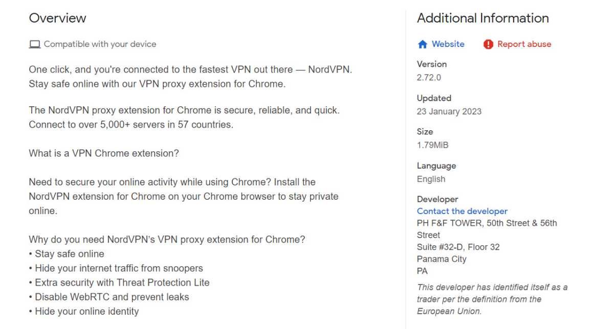 And like most of its rivals, NordVPN’s description of its extensions is very misleading. We spoke to NordVPN about this over a year ago, and it told us it was in the process of updating them to make it clear that using its extension does not encrypt your traffic like a VPN does. However, as of January 2023, the descriptions still don’t do this. Instead, they use the acronym VPN at least as many time as the word proxy. Here’s some of that description: