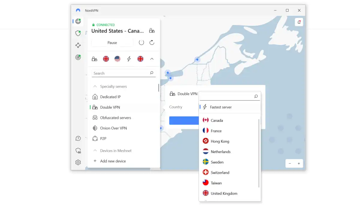 Double VPN routes your connection through two different VPN servers, changing your IP address twice for an extra layer of protection.