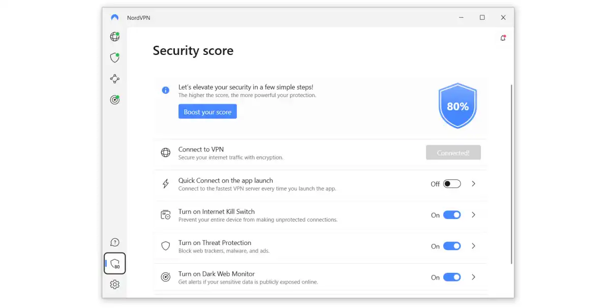 A nice touch is the security score you’ll see in the apps. This helps to highlight some of the features that you might not know about that could improve your overall security, such as auto-connect, kill switch, threat protection and multi-factor authentication.
