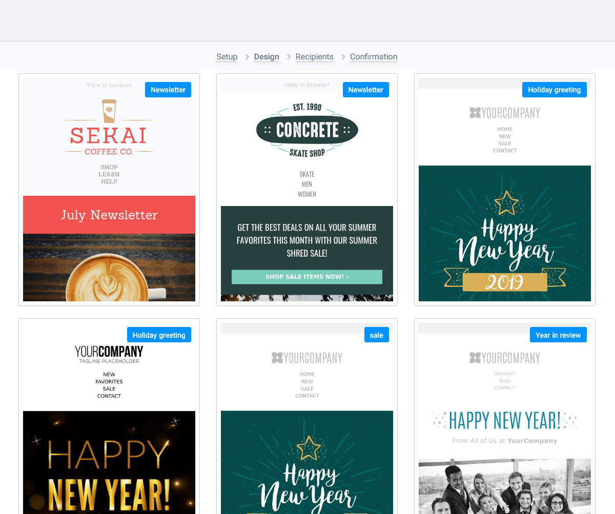Going back to the drag-and-drop editor (which is what most people will probably use), there are 60+ templates you can start with, or you can create a design from scratch if you want to. The templates are a mix of modern/minimal designs, with some being a bit more dynamic and colorful than others. They’re sorted into categories like “Newsletter,” “Sale,” “Holiday Greeting,” and more.