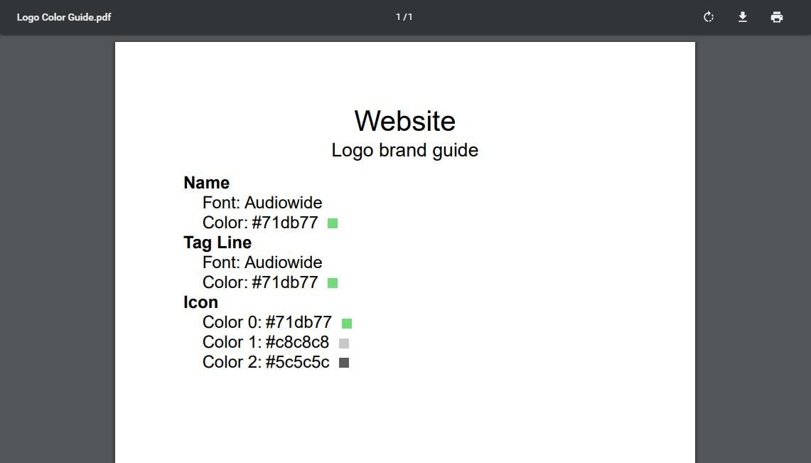 Speaking of small quality of life features, here’s one you may have already seen in the video, but I wanted to address it again, here: the miniature brand guide that comes with your logo files. It’s simple stuff, just hex values for your chosen colors, and the name of the typefaces you chose, but it’s useful to have that information all in one place.